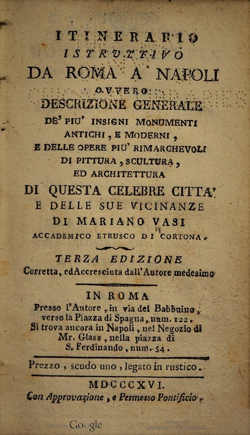 Itinerario istruttivo da Roma a Napoli ovvero Descrizione generale de’ piu insigni monumenti antichi, e moderni, e delle opere piu rimarchevoli di pittura, scultura, ed architettura di questa celebre citta e delle sue vicinanze di Mariano Vasi .